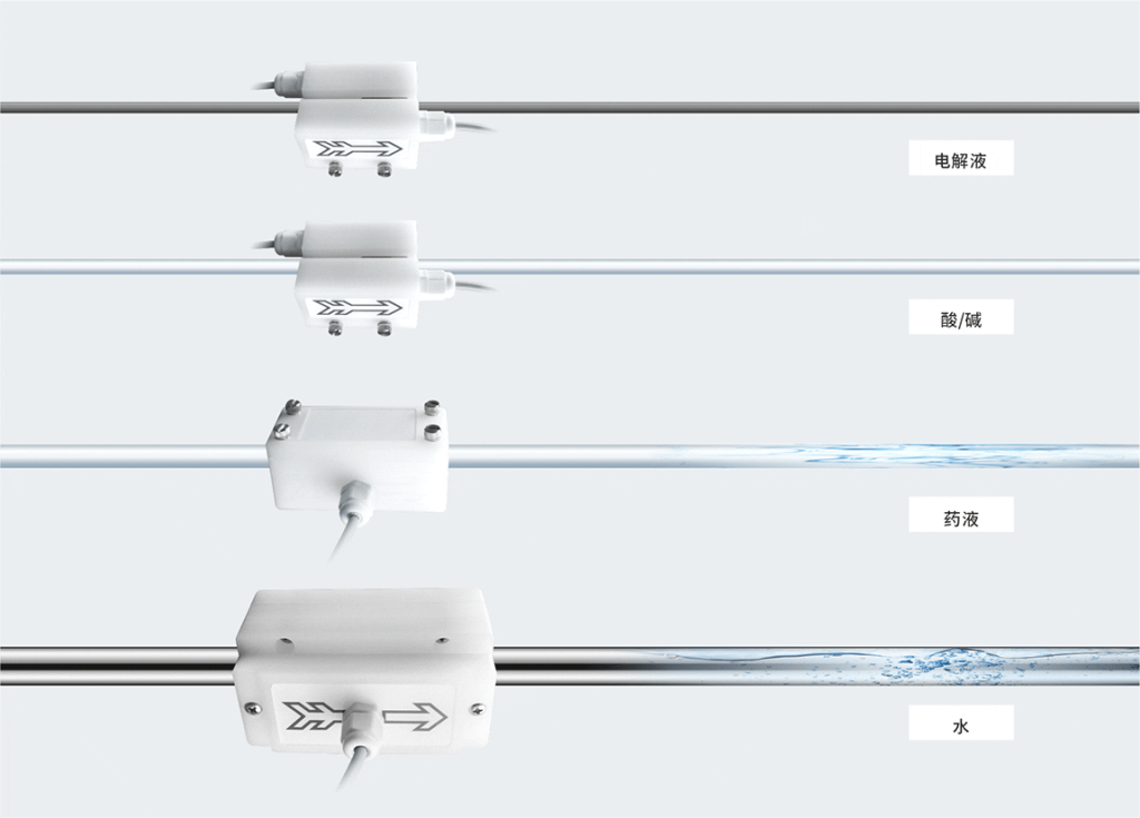 由于是从配管外部进行检测,因此无需担心耐药性的问题,也可放心用于需要避免接触液体的液体流量管理。因此可应用在食品、药品的流量测量。