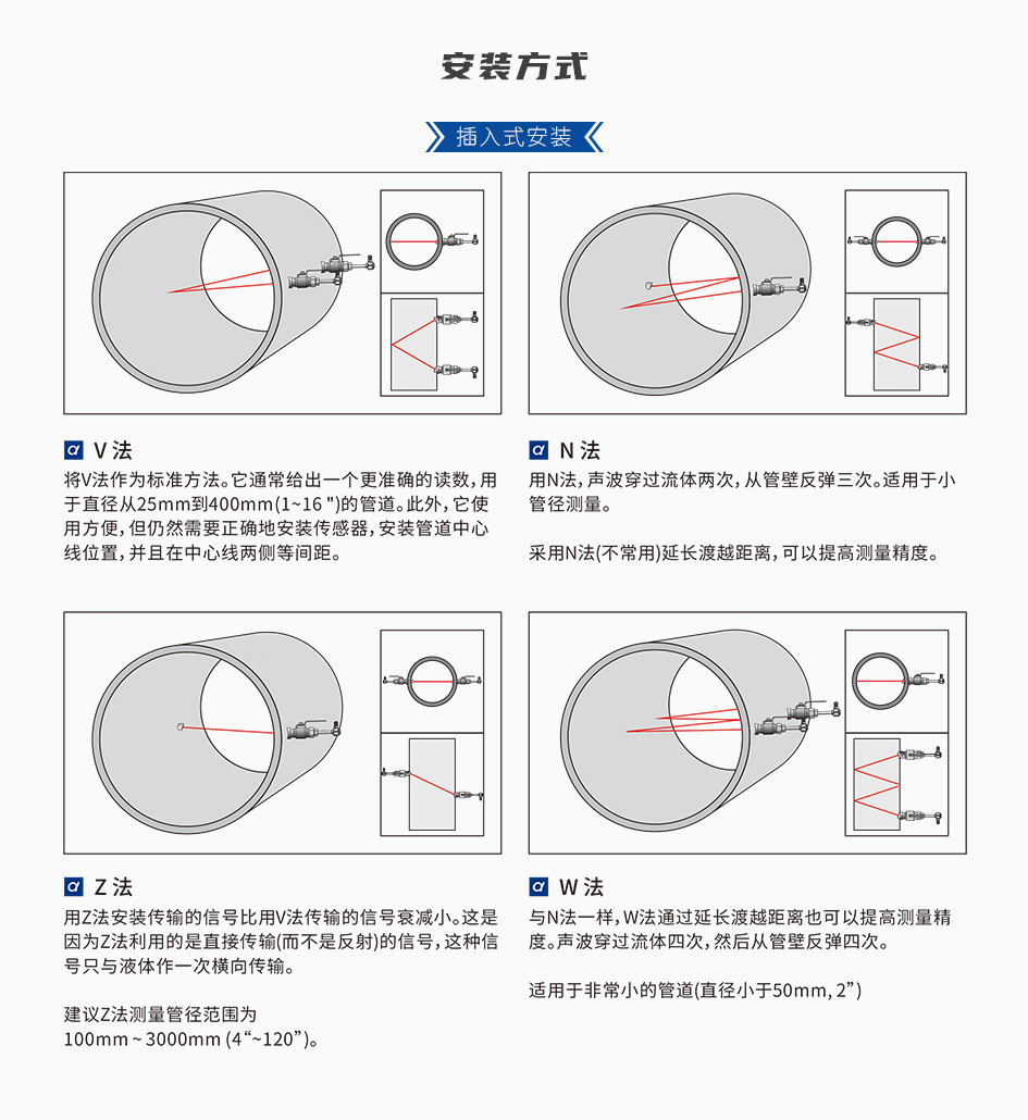外夹式传感器:⼀体式封装设计,采⽤双绞线屏蔽电缆, 标准长度为10⽶,可加长⾄200⽶(每5⽶为⼀个加长单位)