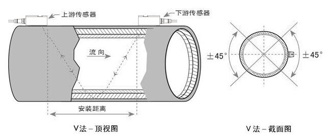 (2)Z法安装方式(见上图)适用于DN400mm以上的大口径管道,两个传感器之间为直线传播路径,没有任何反射折损,这样对于信号损失降到最小,对流体的稳定性要求较V法要高。