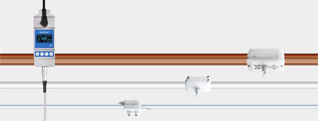 超声波流量计可以用于测量封闭管道内满管得液体的体积流量,迅昇超声波流量计可以测量0~12m/s流速的液体,高于12m/s可以通过定制解决,这是超声波流量计的产品优势,而且如果是外夹式超声波流量计,那么几乎对管径尺寸是没有要求的,深圳迅昇最小有能测9.53mm管道口径的外夹式超声波流量计,最大能支持5000mm。