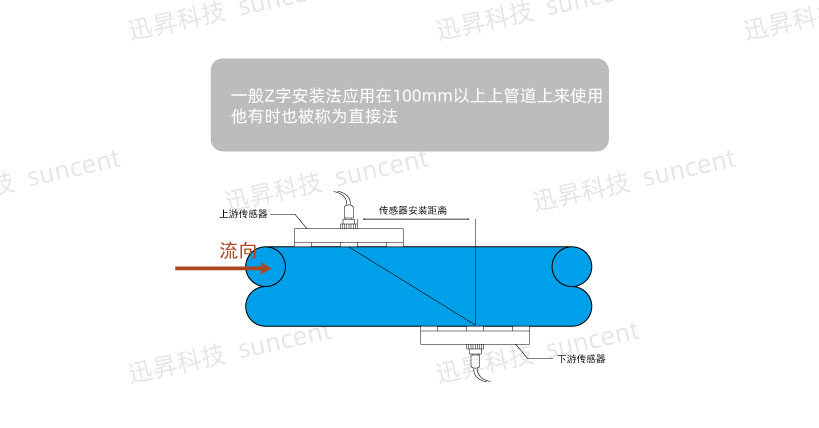 采用两种方法安装流量传感器,即对称安装和同侧安装。对于中、小型管直径(一般小于600mm)和含有较少悬浮颗粒或气泡的液体,同侧安装适用于各种管径的管道和含有大量悬浮颗粒或气泡的液体。